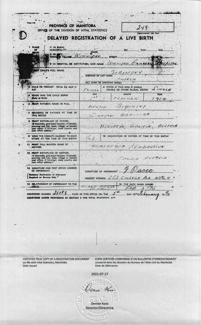 Birth Certificate of Angela Bobowsky (1914 - 2015)