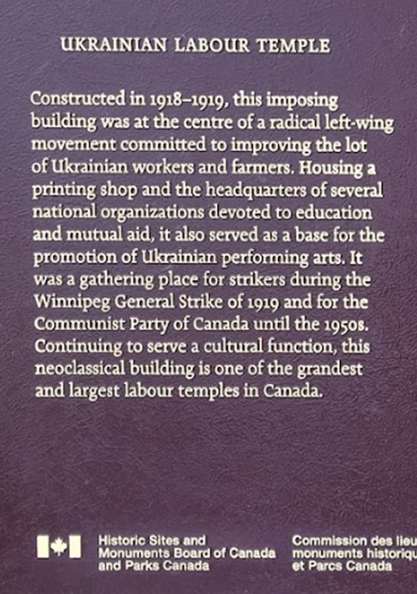 Constructed in 1918-1919, this imposing building was at the centre of a radical left-wing movement committed to improving the lot of Ukrainian workers and farmers. Housing a printing shop and the headquarters of several national organizations devoted to education and mutual aid, it also served as a base for the promotion of Ukrainian performing arts. It was a gathering place for strikers during the General Strike of 1919 and for the Communist Party of Canada until the 1950s. Continuing to serve a cultural function, this neoclassical building is one of the grandest and largest labour temples in Canada.